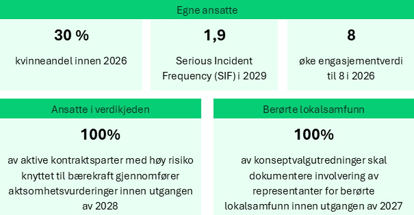For våre egne ansatte har vi arbeidet systematisk med målsetninger over tid. For ansatte i verdikjeden og berørte lokalsamfunn har vi besluttet nye målsetninger som en del av omstillingsplanen.