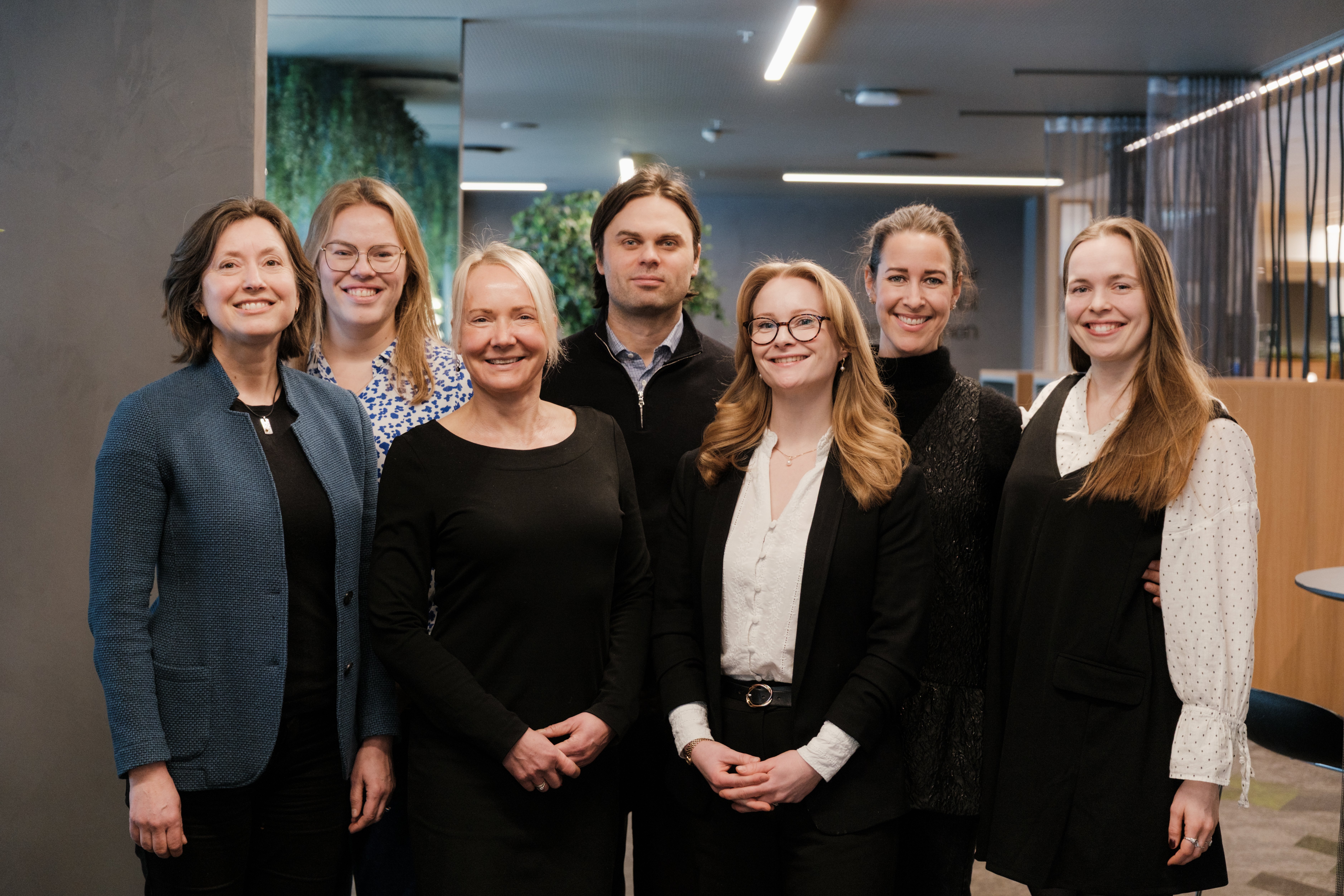 Bærekraftsteamet i Statnett har jobbet med den nye omstillingsplanen, fra høyre: Isabelle Arntzen, Linn Tvede, Johanne Sofie Iversen, Fredrik Storhaug Nordbø, Mai Lawson Oldgard, Milla Sandborg Mathisen og Caroline Bergrem-Maldan. FOTO: Statnett
